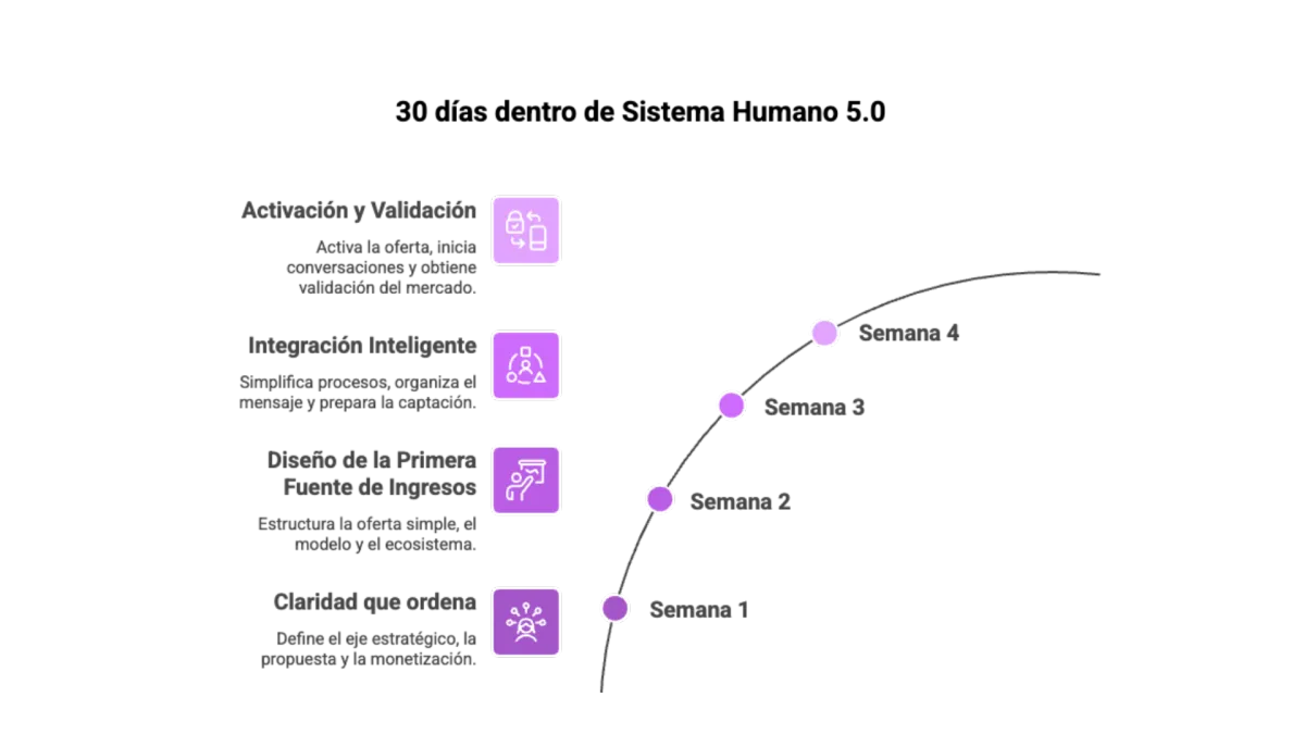 Mi metodología del sistema Humano 5.0 está diseñada para la eficiencia. El objetivo final es que tu negocio digital funcione con solo 10 horas a la semana gracias a los sistemas de automatización e Inteligencia Artificial que implementaremos juntos.